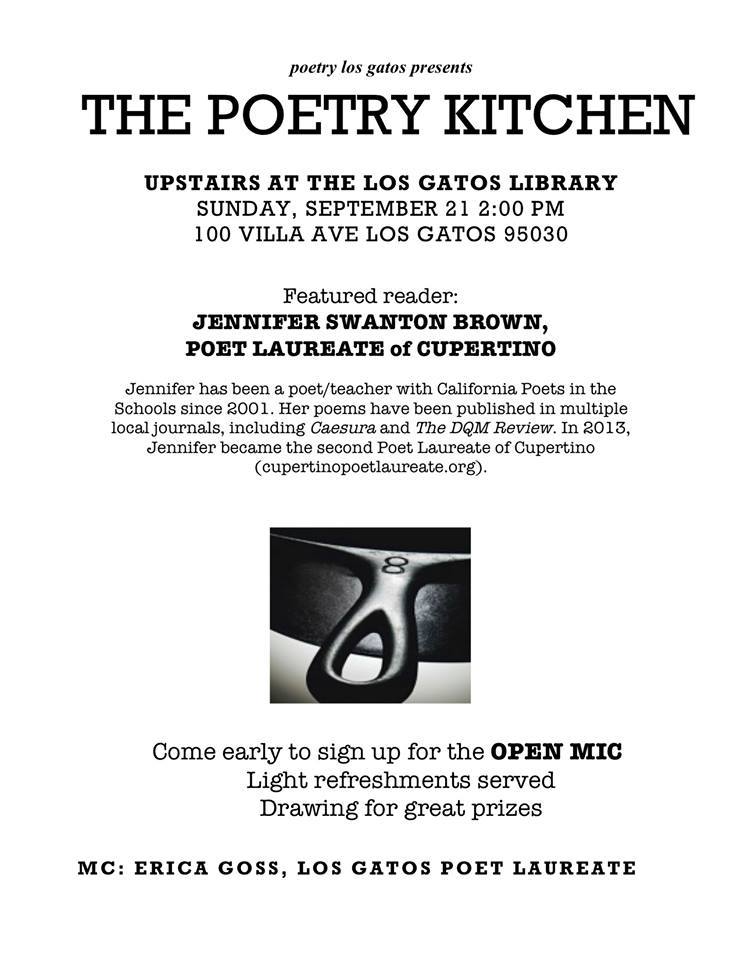 This Sunday I’ll be joining the lovely Erica Goss, Los Gatos Poet Laureate, for her Poetry Kitchen reading series. Come hear! And, come read — there will be an open mic following.