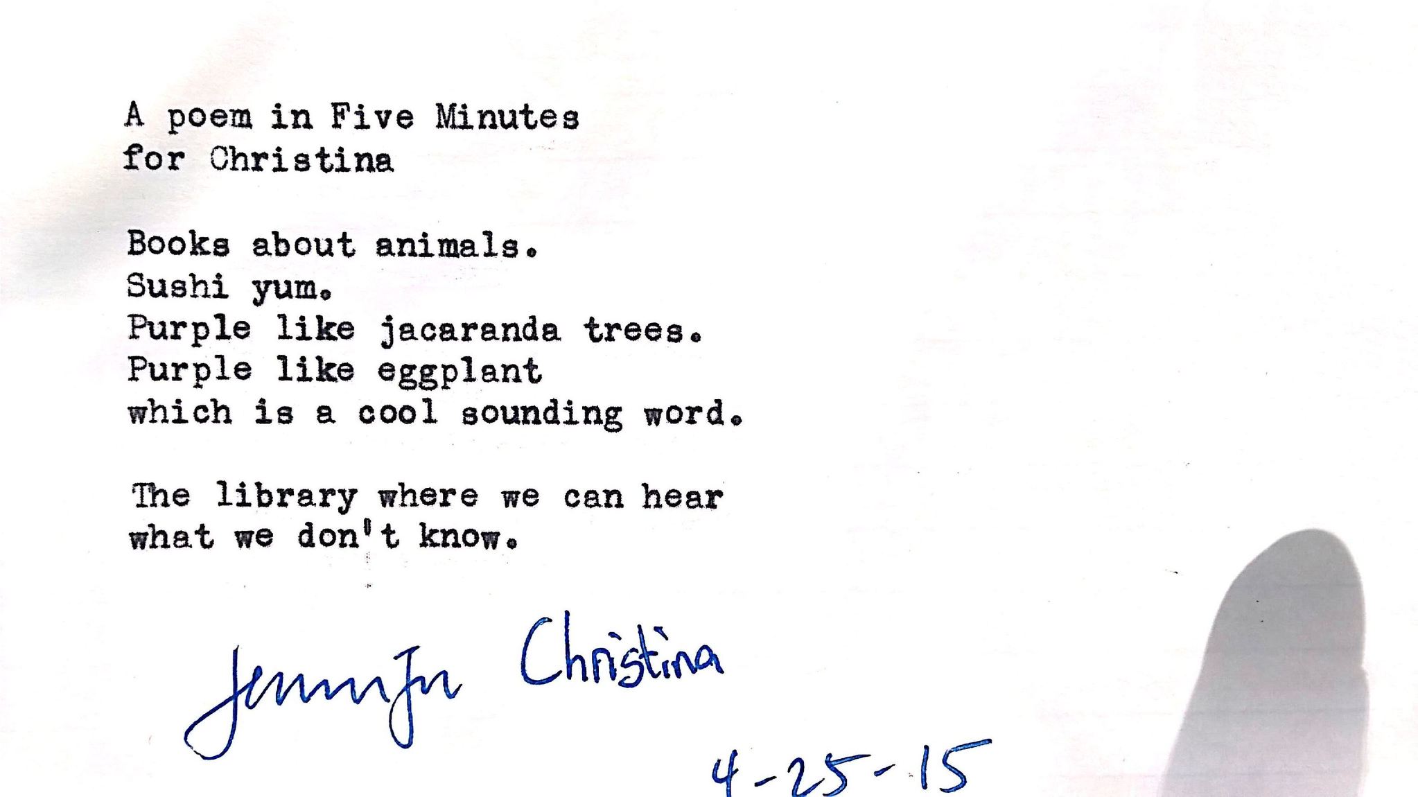 One of my favorite poems was a collaboration with a sweet young person named Christina, who kept saying “I don’t know” when I’d ask her things. Funny what appears in poems.