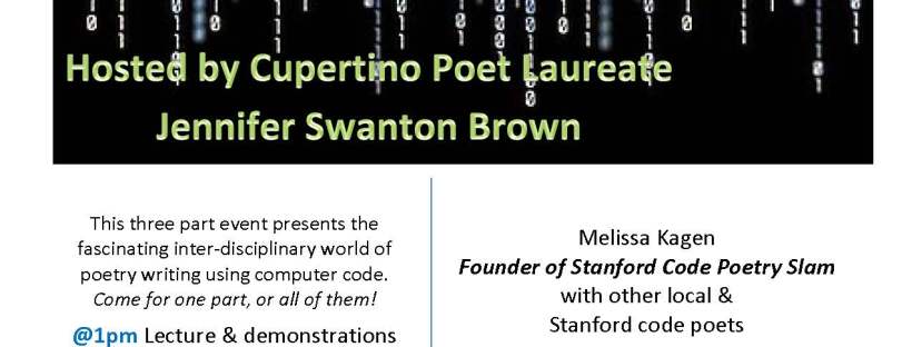 Get ready for the May 2 Code Poetry Hack-a-thon and Slam, taking place at the Cupertino Community Hall from 1-4 pm. Guests from Stanford University, hosted by the Cupertino Poet Laureate.