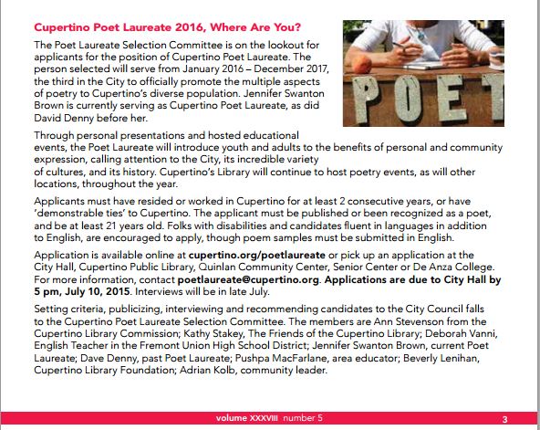 On January 7, 2016, Cupertino will welcome its third Poet Laureate, Amanda Williamsen, and express its thanks to its second Poet Laureate, Jennifer Swanton Brown.