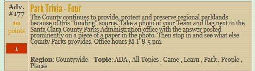 We went inside the office, read through many brochures, and finally had to get help from the lovely office staff. The “funding source” is the Parks Charter Fund! Here is our photographic proof. (And thanks to the Parks Charter Fund for supporting this really great game.)
