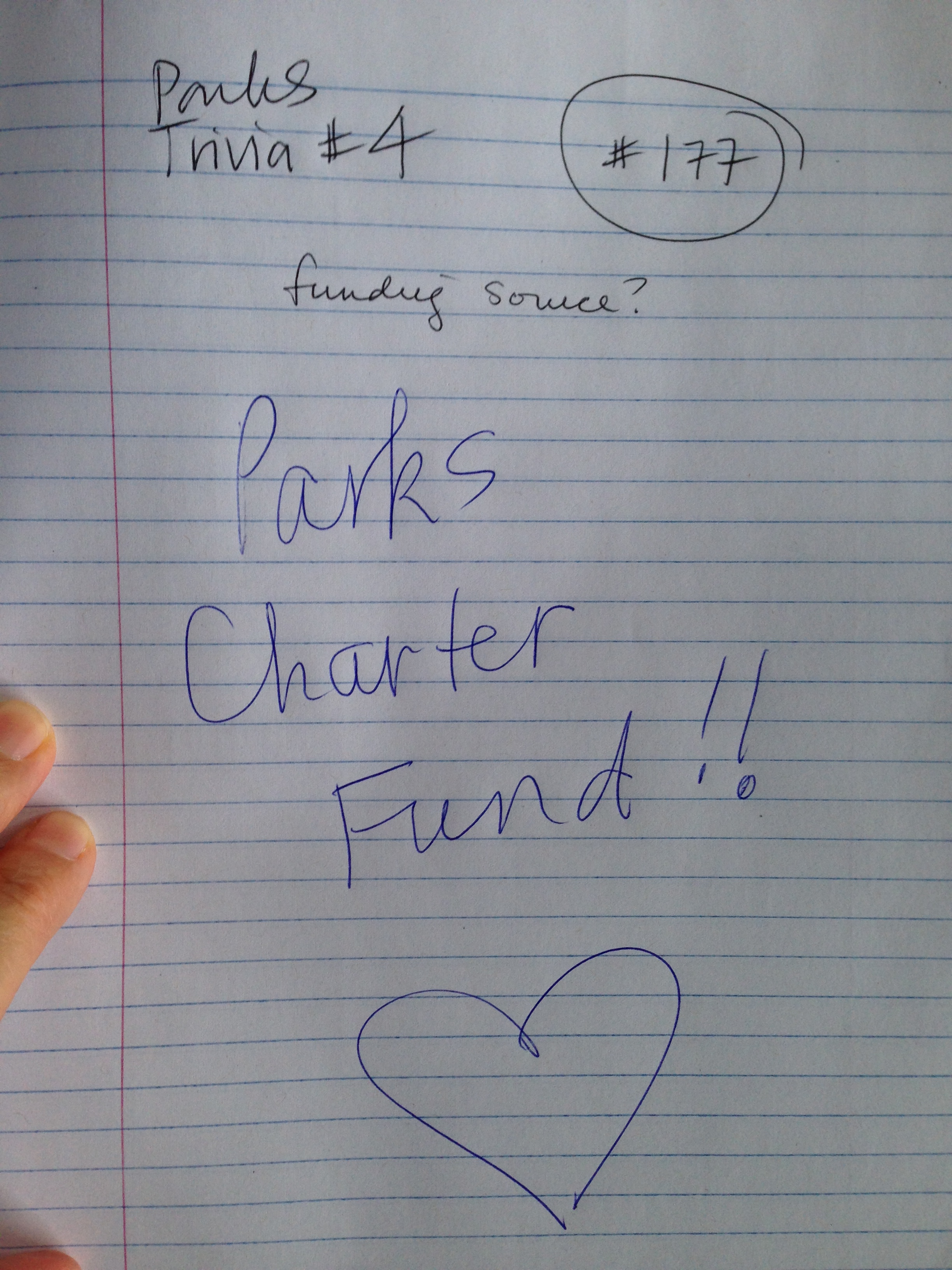 Parks for Life Adventure # 177 (if you zoom in on the photo you can see that the paper says “Parks Charter Fund!” with a heart)