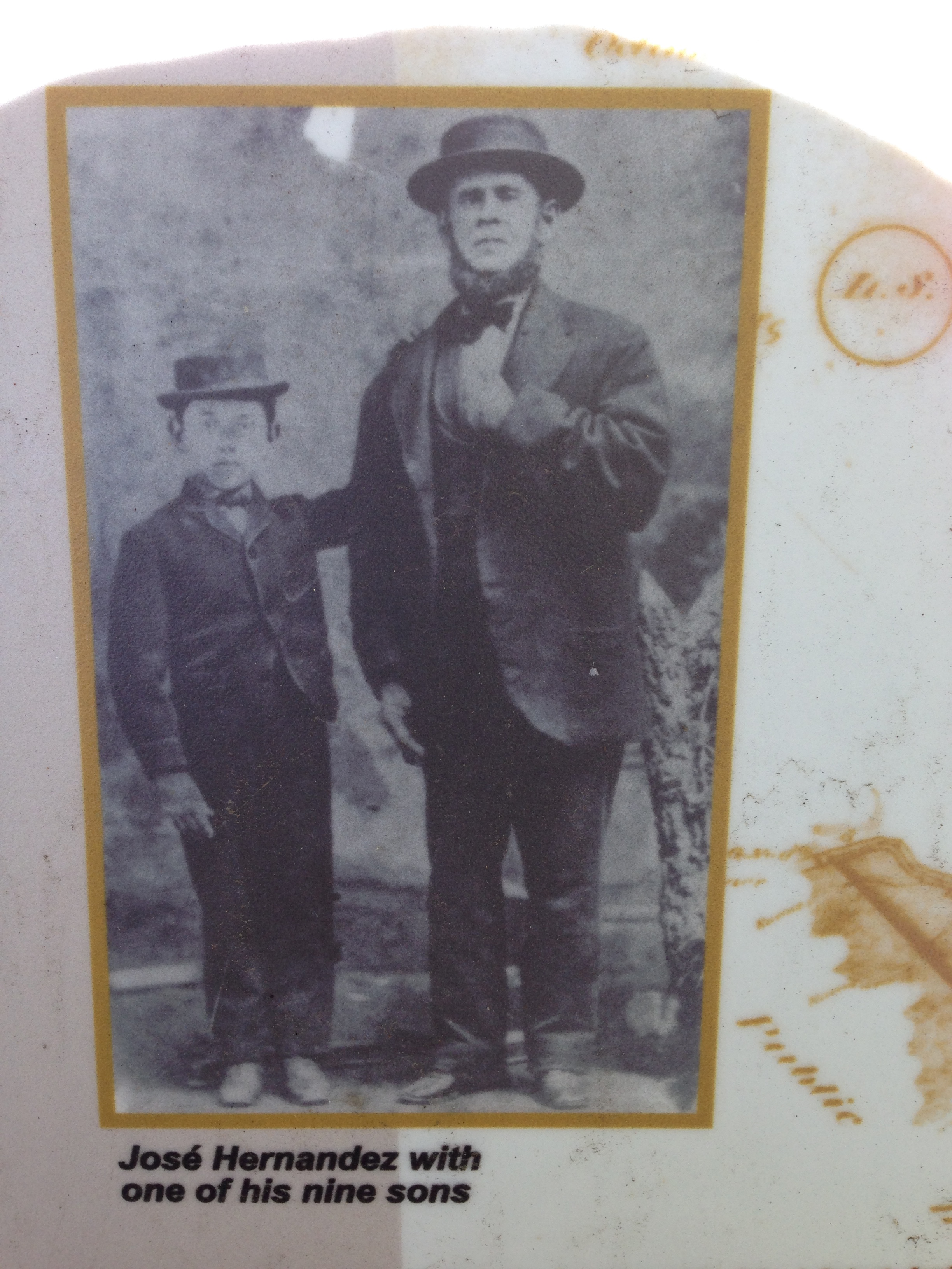 Next we wandered over toward the Juan Maria Hernandez Adobe Historic Landmark near the entrance to the park. The historical marker was placed in the park in 2014, and Erica wrote a poem to read at the unveiling. (Check out this story about that event). The Parks for Life Adventure #4 is a challenge to “take a goofy picture of yourself at a historic landmark” — well, we decided that we’d replicate the photo of “Juan Hernandez with one of his nine sons” — so here we are. I’m posing like the old man Juan (very stuff and self important) and Erica is sticking her tongue out in the way we imagine “one of his nine sons” might have felt like doing after he was done posing for the camera.
