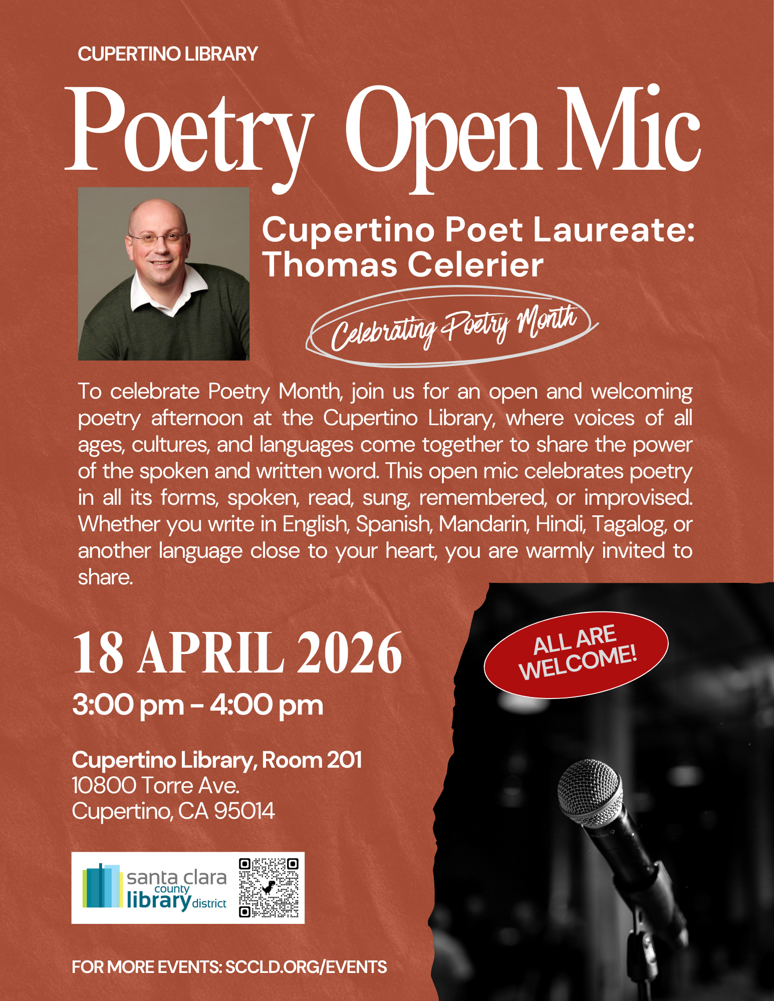 Please take a moment to review the ongoing and upcoming Cupertino Poet Laureate events! Past CPL events can be found on the Past Events page.