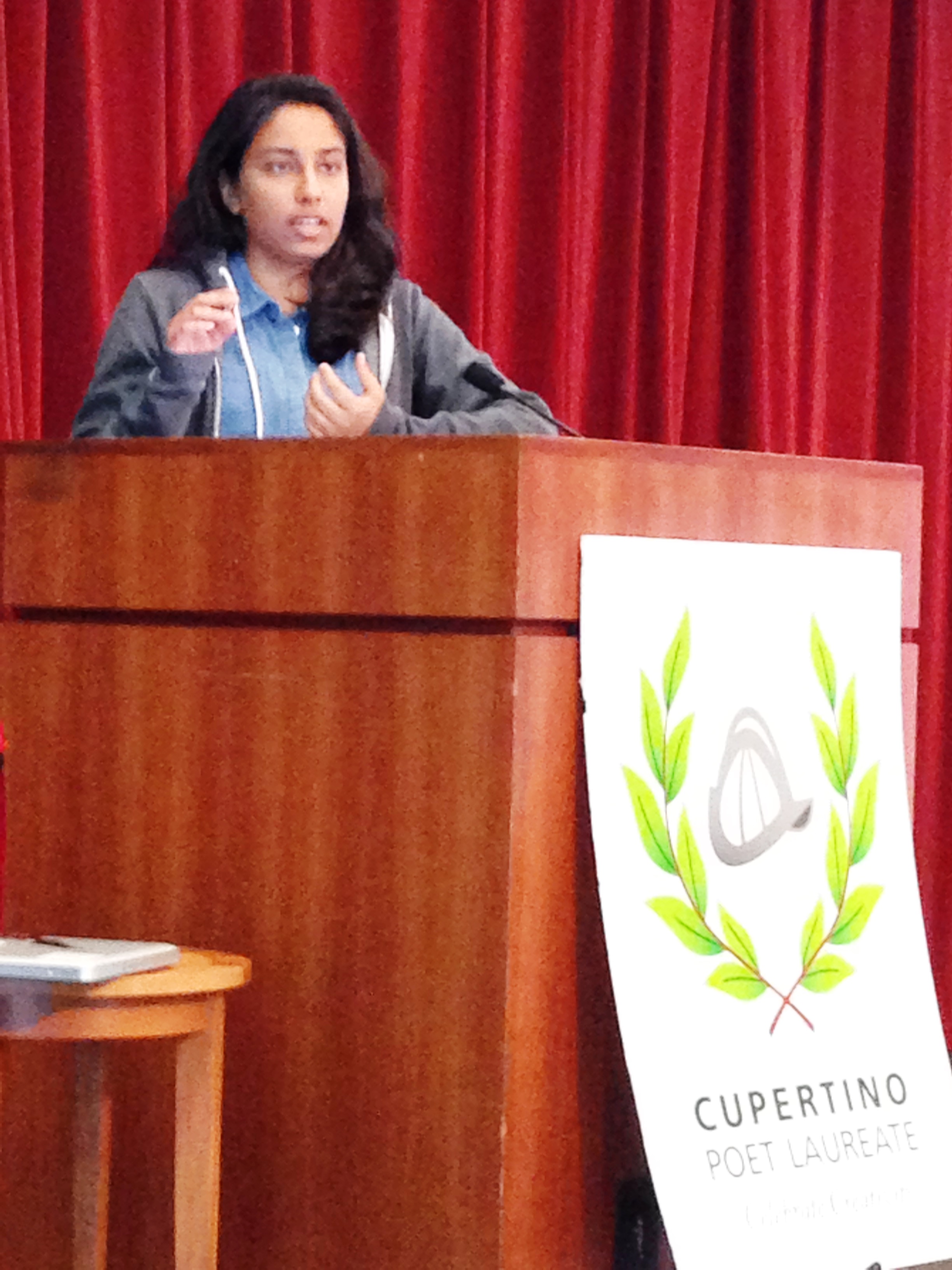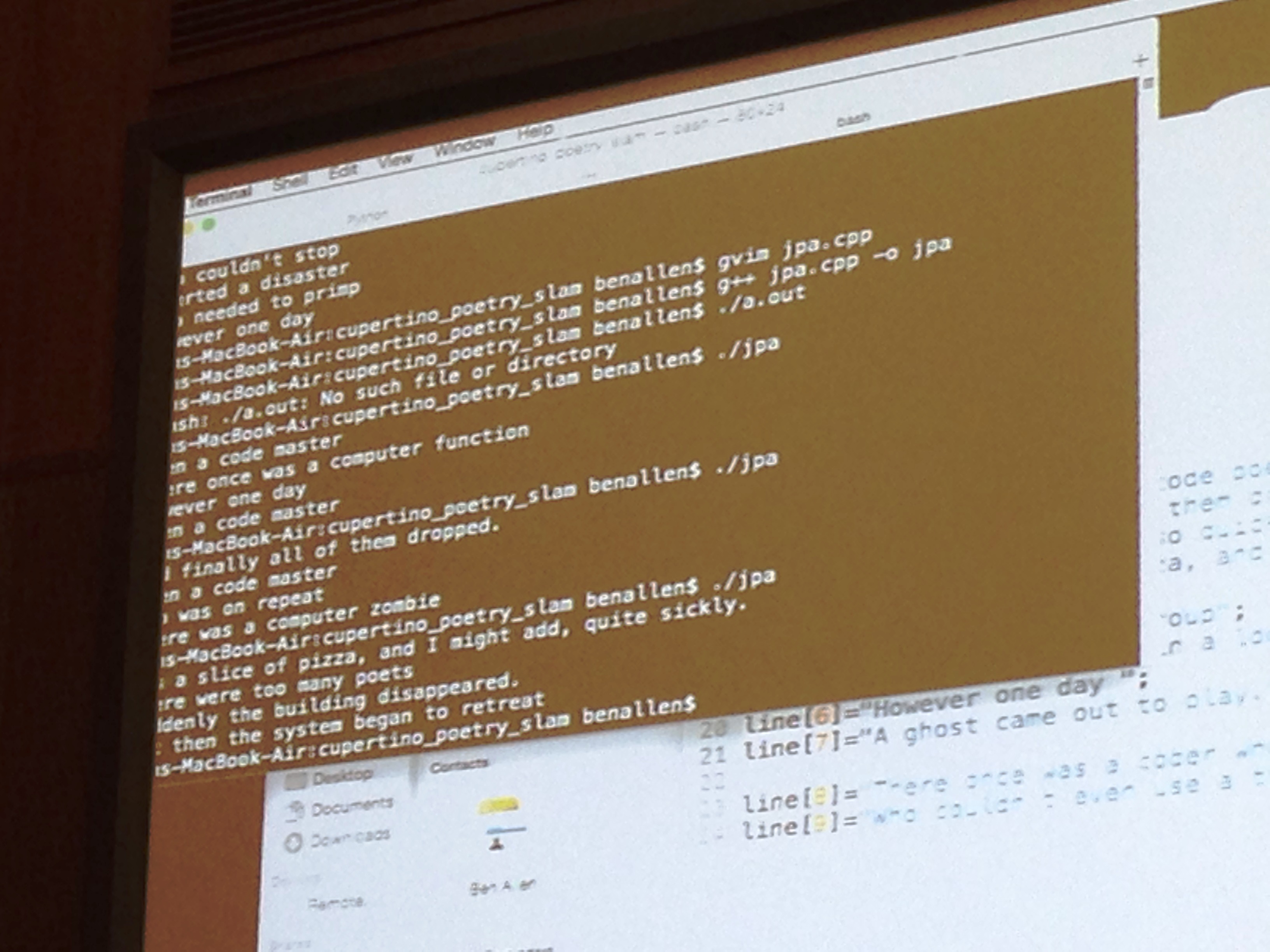 It was our first ever Cupertino Code Poetry Hack-a-thon and Slam. We had no idea what we would happen. But, in the end, plenty of people showed up, and we slammed six poems at the end of three hours of concentrated fun. I am so pleased and grateful to all who helped and came out for our wild and crazy tech + art event.