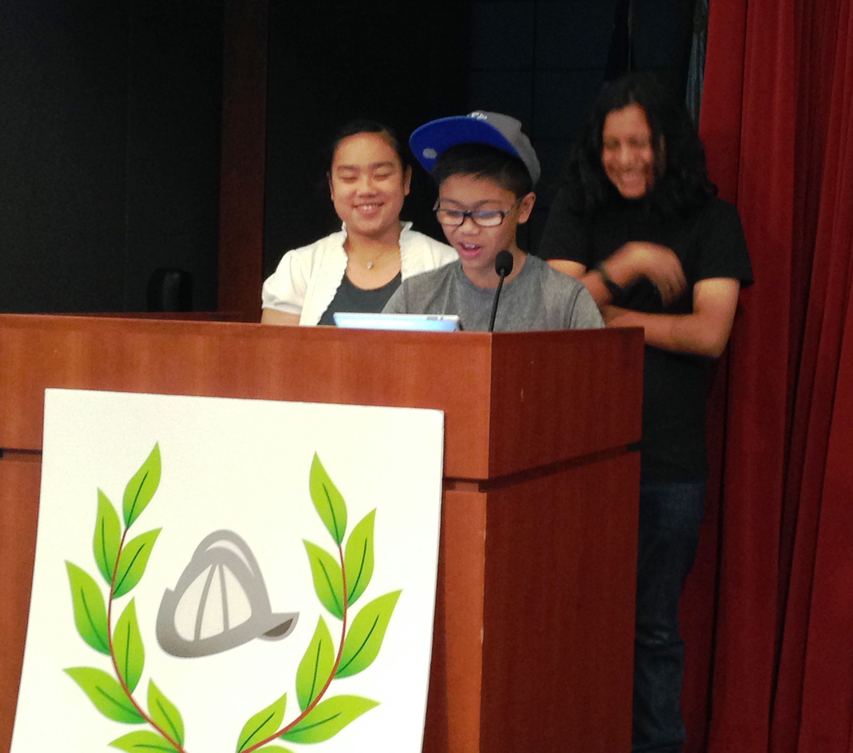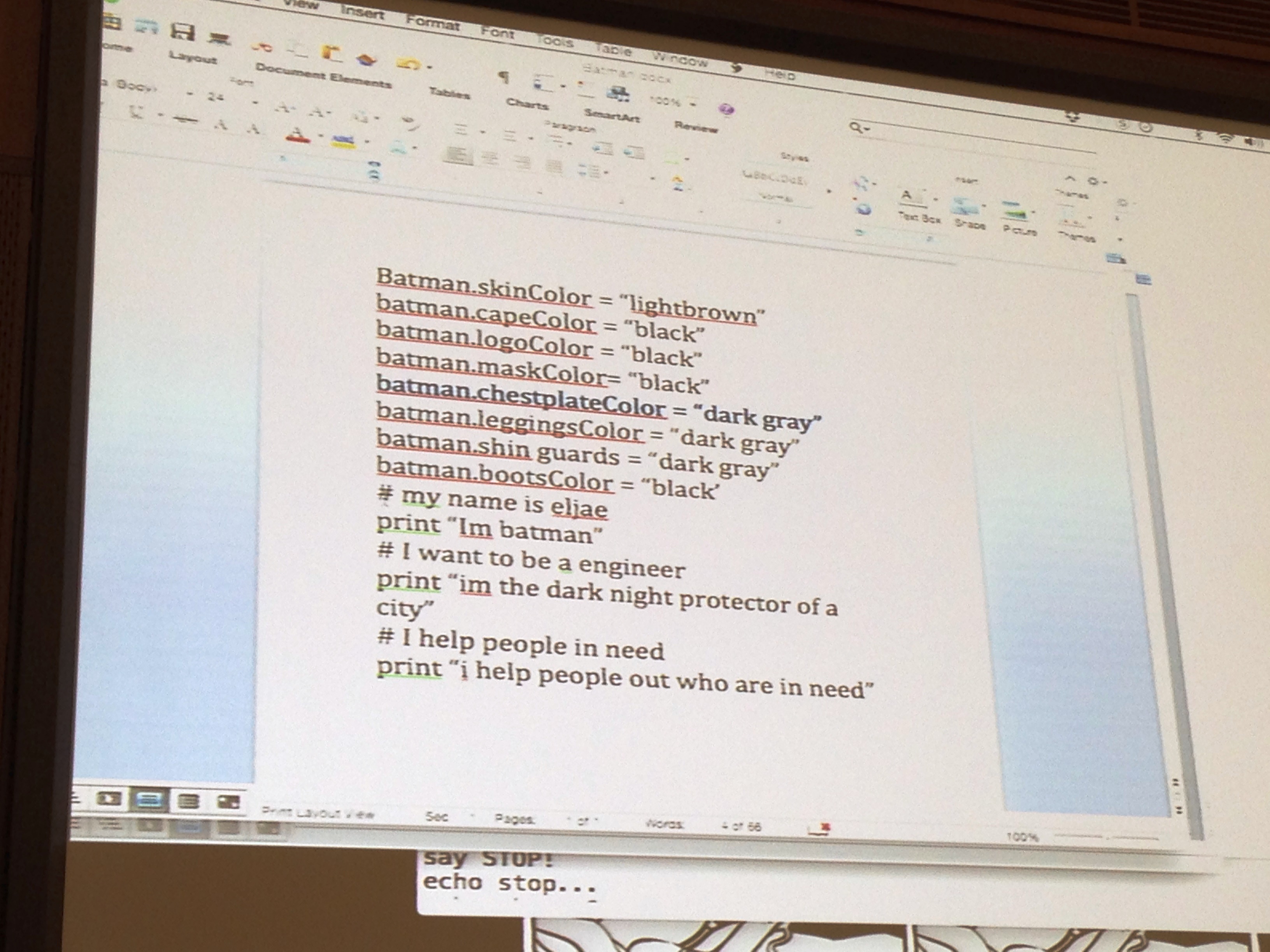 Table 3, also students from Ms. M’s class, worked on their poem with Stanford Code Poetry Slam founder Melissa Kagen and then presented it with another Stanford Code Poetry guest Ben Allen. Their poem was about Batman.